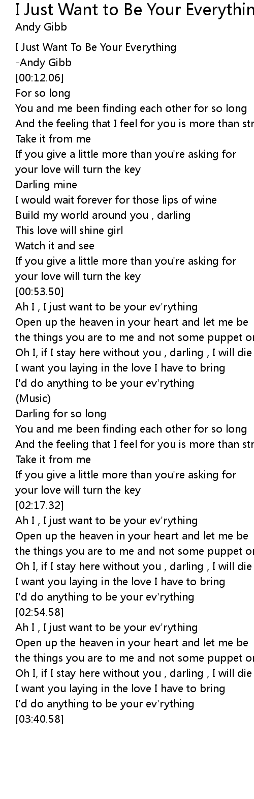 Andy Gibb I Just Want To Be Your Everything Lyrics. Oh, if i stay here without you, darling, i will die. For so long / you and me been finding each other for so long / and the feeling that i feel for you /. It reached number 1 on the billboard hot 100 during the week. I just want to be your everything lyrics: For so long you and me been findin' each other for so long and the feelin' that i feel for you is more than strong, girl. I just want to be your ev'rything (be your everything) open up the heaven in your heart and let me be. I just want to be your everything artiste: If i stay here without you, darling i will die. I just want to be your everything is a song recorded by andy gibb, initially released in 1977. I'd do anything to be your everything. The things you are to me and not some puppet on a string. Open up the heaven in your heart and let me be. I want you layin' in the love i have to bring. Open up the heaven in your heart and let me be. I want you laying in the love i have to bring.